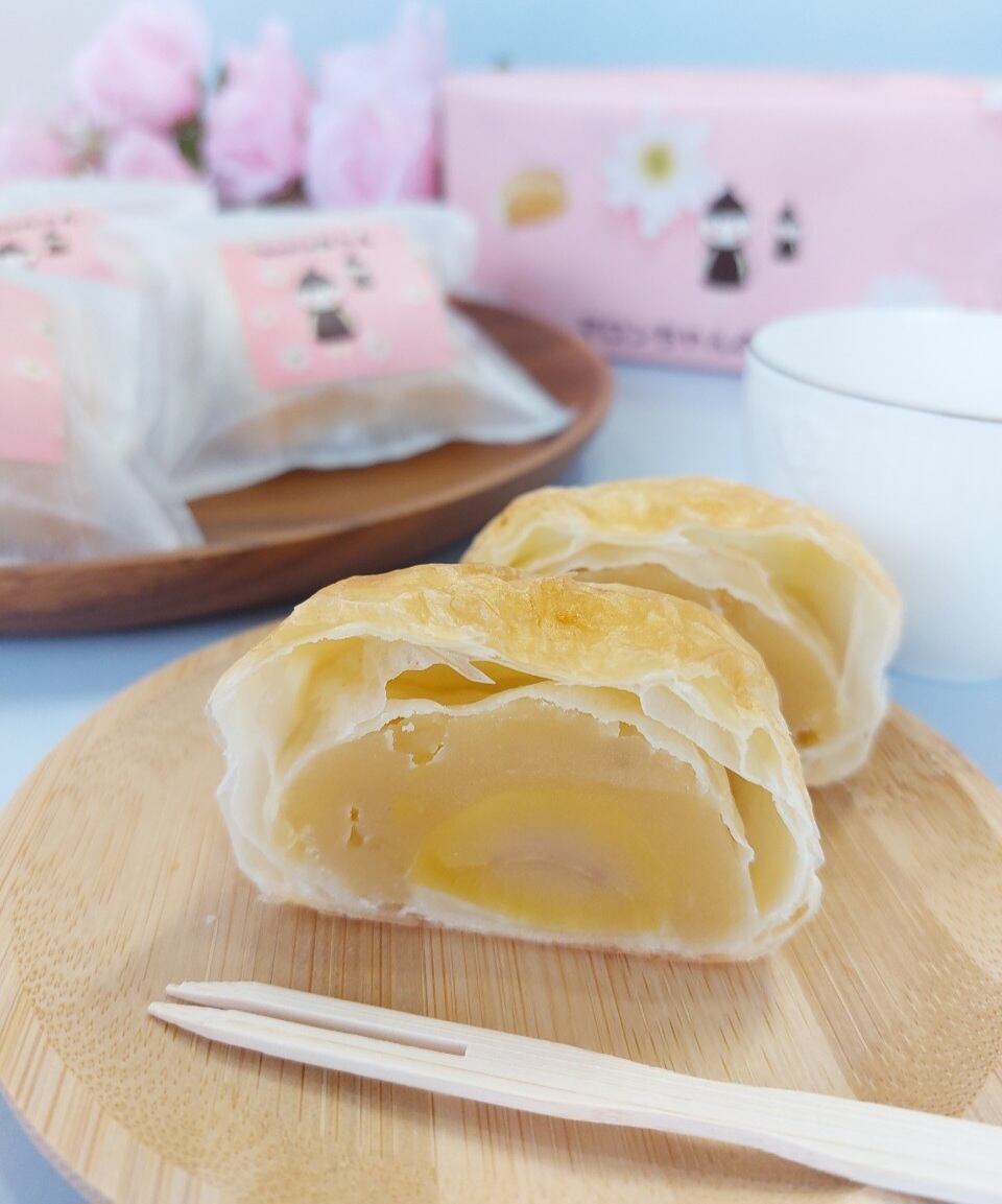 甘くてほっこりとした味わいのマロンパイ、マロンちゃんのマロンパイです。しっとりとしたパイ生地の中には、濃厚なマロンあんがたっぷりと詰まっています。優しい甘さととろけるような食感が楽しめる一品です。